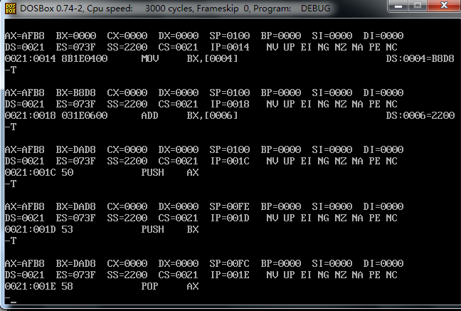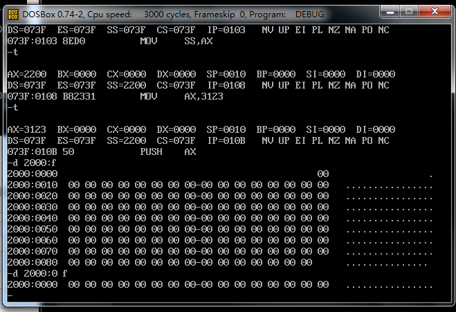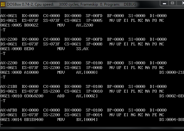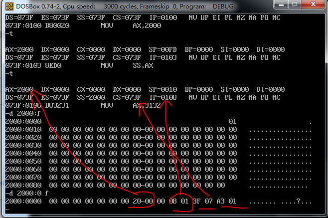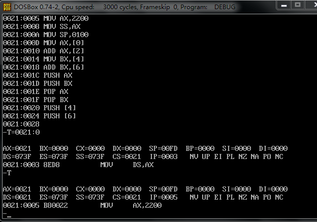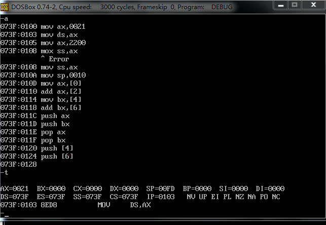 分析了一下,一开始我没有作对的原因。我一开始指定了 从0021:0 开始写入,我明明把00210:f 设置成了数据域 现在又对它进行指令操作,自然是不能得到预想结果的。