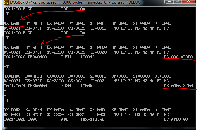 上图可以看到 将ds为0021的 偏移数据的段地址为 [0]的内存打单元给寄存器ax 采用小端法的化读入的是3130