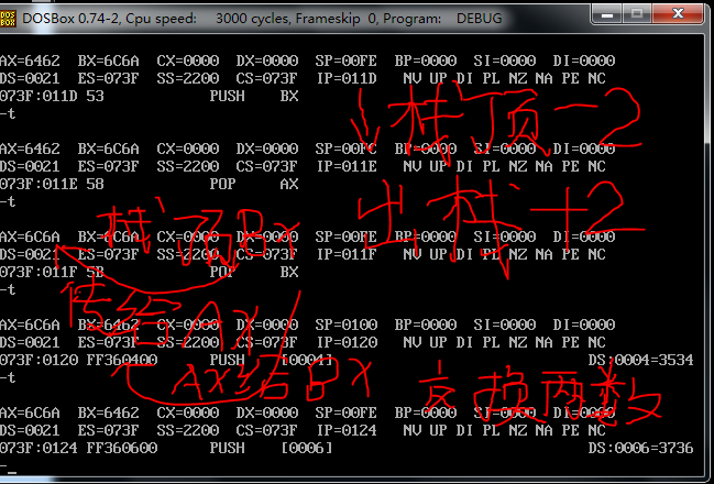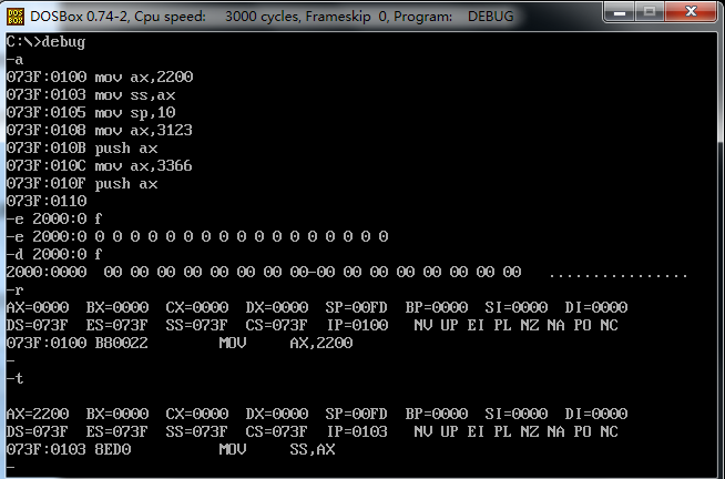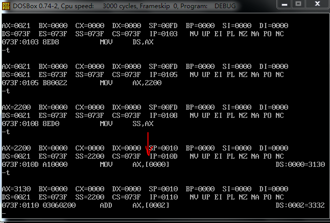 看了其他同学的博客之后才注意到,mov sp 0100 跳过了。这里其实是 和mov ss,ax 一起执行了