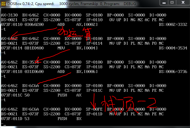 ② 截图记录:使用 a 命令输入的 p74 指令③ 截图记录:每一行指令单步调试(如单步调试步骤多,可分屏截图,但不要有遗漏)