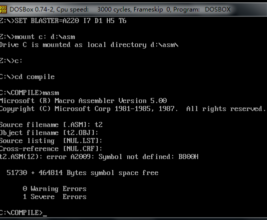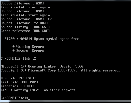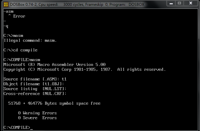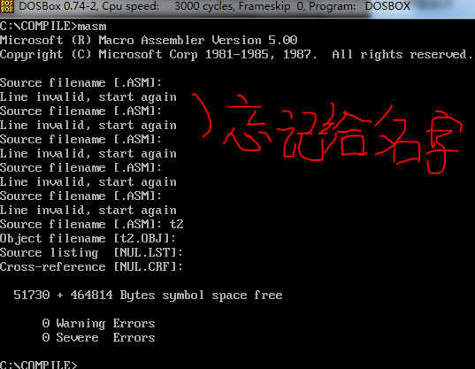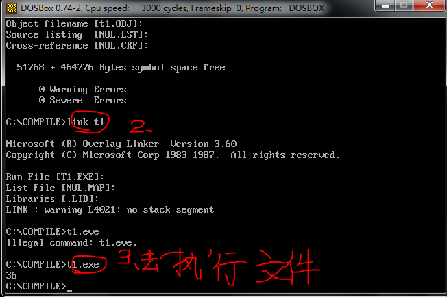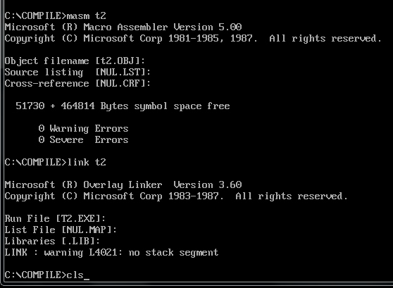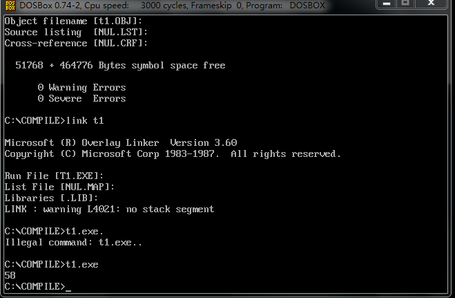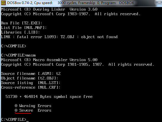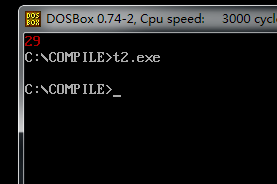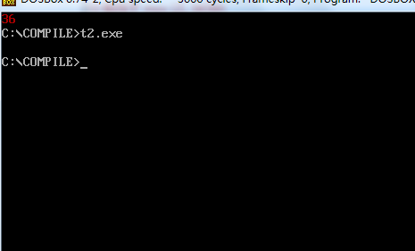 注*)经测试,有些平台在 dosbox 下运行这个程序时有些问题,如果屏幕左上方没有 输出结果,请运行程序 t2.exe 前,先输入 cls 命令清空一下屏幕,然后再执行 t2.exe。
