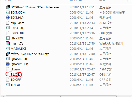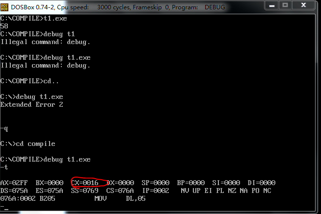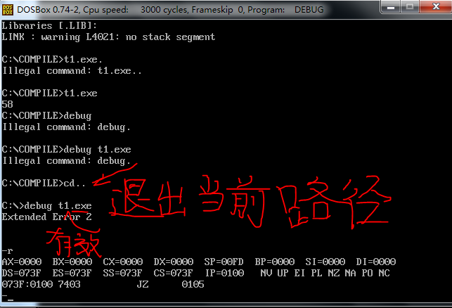 后来我才知道debug.exe 和 t1.exe 文件没有放在一个路径下面的原因。