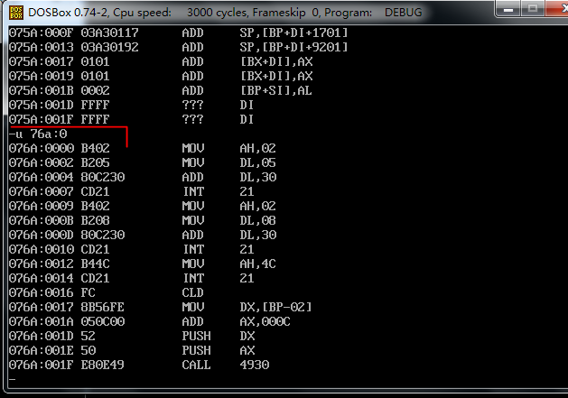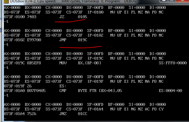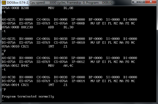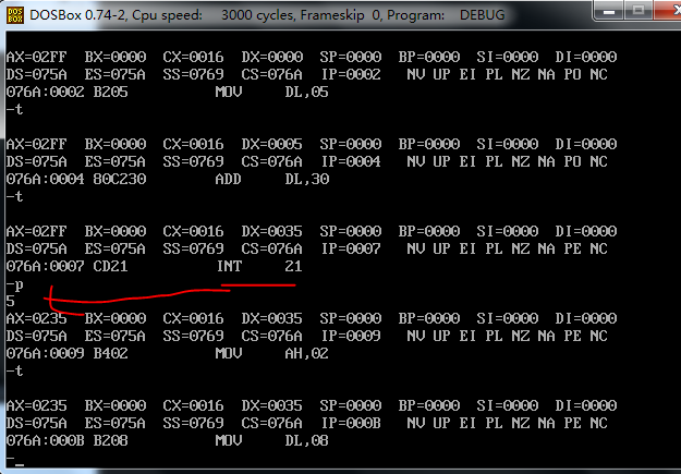 ④ 使用 t 命令和 p 命令(遇到 int 命令时,用 p 命令)单步调试,观察结果。