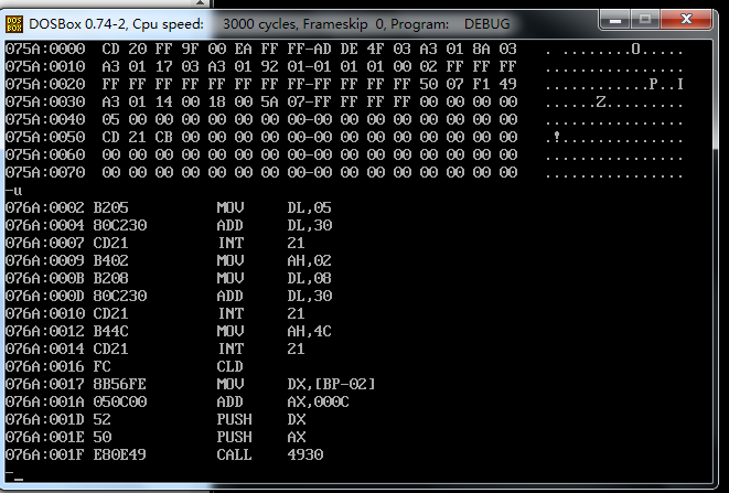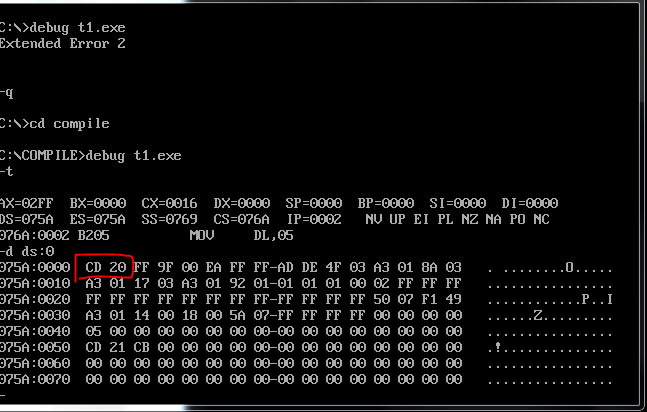 ② PSP(程序段前缀)的头两个字节是 CD 20, 用 debug 查看 PSP 的内容,验证是否如此