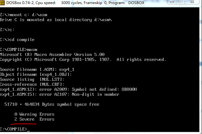 第一个是 给出内存单元地址的时候,在字母前没有加零 。就能执行了截图如下: