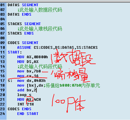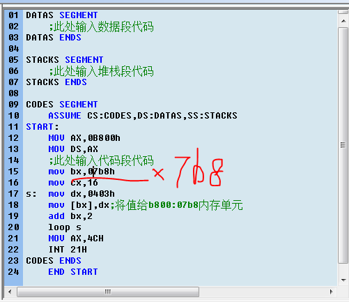 1. 综合使用 loop,[bx],编写完整汇编程序,实现向内存 b800:07b8 开始的连续 16 个 字单元重复填充字数据 0403H。