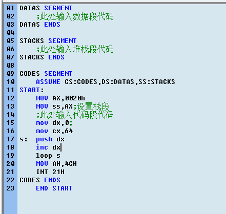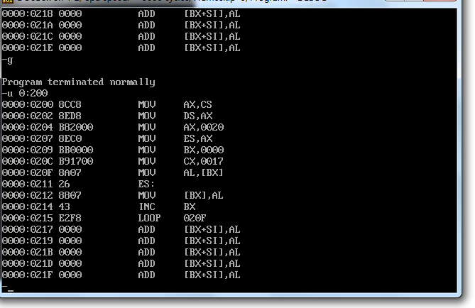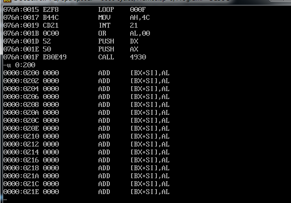 cx的一开始的值恐怕不是随意给的0 ,这样才能知道指令的长度。如上图所示指令长度是001B 实际上只要复制到 0017就可以了(INT 21 前就可以了)