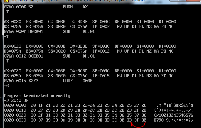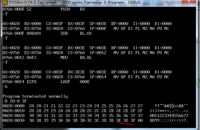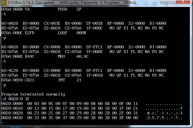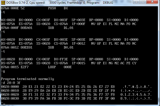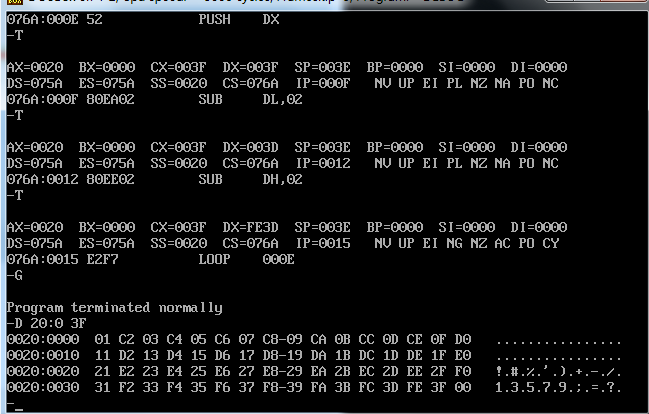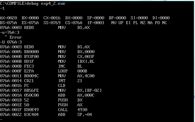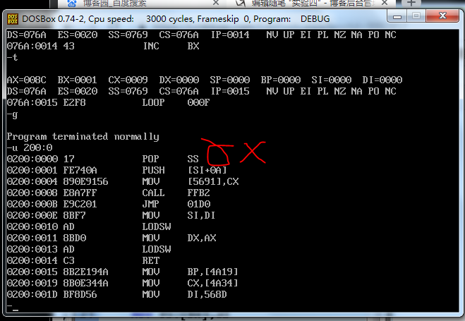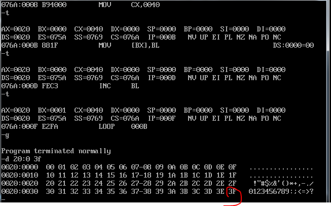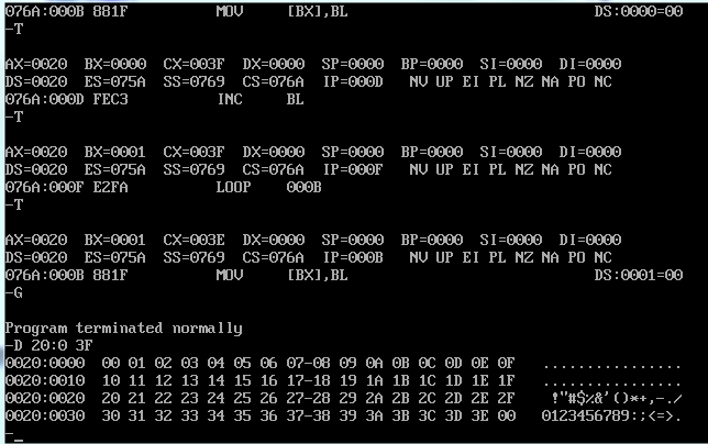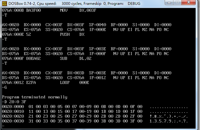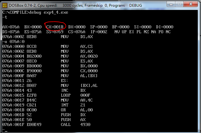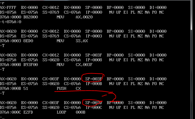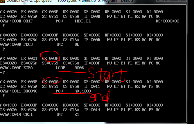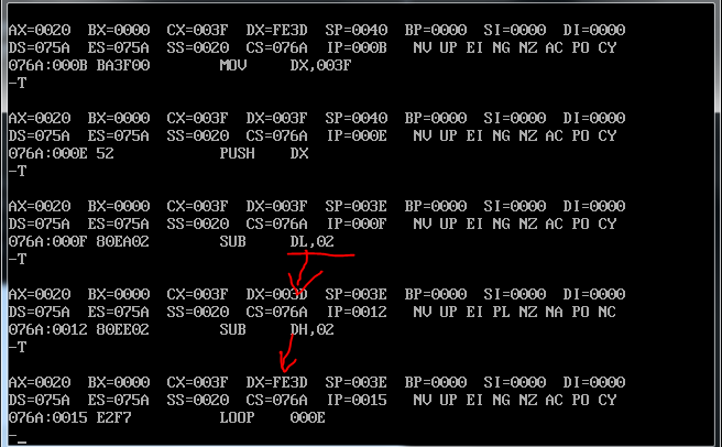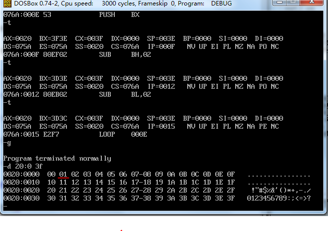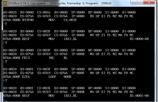 但应该只要在loop 000B 下面使用-P 就可以一次执行完循环(ps:一开始老师和我们说的这个-p和-t的时候我有点反应不过来,因为没有仔细深究过以循环体为单位和 每次循环的情况为单位的区别,所以又有一点点为自己的基础感到自卑。不过好在我后来知道了。)