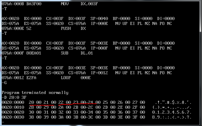 书P 0:200~0:20b 等于0020:0~0020:b 的形式,显然没有在一开始就反应归来,否则也不会不想到利用偏移地址变化的数字对内存单元进行赋值了。