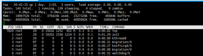 CPU状态:0.0%us用户使用的;sy系统用到的;100.0%id表示空闲的cpu