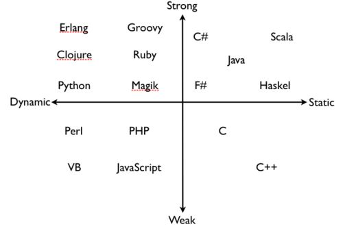 动态类型语言和静态类型语言1、动态类型语言 很多网上资料把动态类型语言和动态语言混为一谈,简直是误人子弟。动态类型语言和动态语言是完全不同的两个概念。动态类型语言是指在运行期间才去做数据类型检查的语言,说的是数据类型,动态语言说的是运行是改变结构,说的是代码结构。 动态类型语言的数据类型不是在编译阶段决定的,而是把类型绑定延后到了运行阶段。 主要语言:Python、Ruby、Erlang、JavaScript、swift、PHP、Perl。 2、静态类型语言 静态语言的数据类型是在编译其间确定的或者说运行之前确定的,编写代码的时候要明确确定变量的数据类型。 主要语言:C、C++、C#、Java、Object-C。 3、注意: 相当一部分程序员,也包括曾经的我,认为解释型语言都是动态类型语言,编译型语言都是静态类型语言。这个也是错的。swift是编译型语言但是它也是动态类型语言。C#和Java是解释型语言也是静态类型语言。 强类型语言和弱类型语言1、强类型语言: 强类型语言,一旦一个变量被指定了某个数据类型,如果不经过强制类型转换,那么它就永远是这个数据类型。你不能把一个整形变量当成一个字符串来处理。 主要语言:Java、C#、Python、Object-C、Ruby 2、弱类型语言: 数据类型可以被忽略,一个变量可以赋不同数据类型的值。一旦给一个整型变量a赋一个字符串值,那么a就变成字符类型。 主要语言:JavaScript、PHP、C、C++(C和C++有争议,但是确实可以给一个字符变量赋整形值,可能初衷是强类型,形态上接近弱类型) 3、注意: 一个语言是不是强类型语言和是不是动态类型语言也没有必然联系。Python是动态类型语言,是强类型语言。JavaScript是动态类型语言,是弱类型语言。Java是静态类型语言,是强类型语言。 |