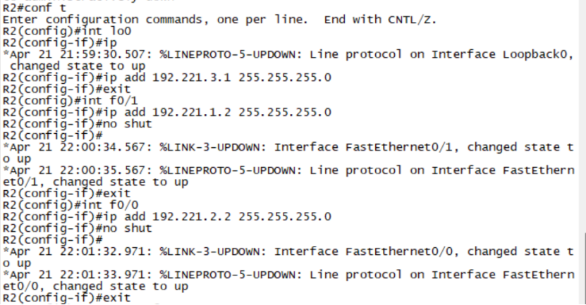 1、根据实验拓扑,对路由器各接口配置IP地址。IP地址第二字节修改为自己学号后3位