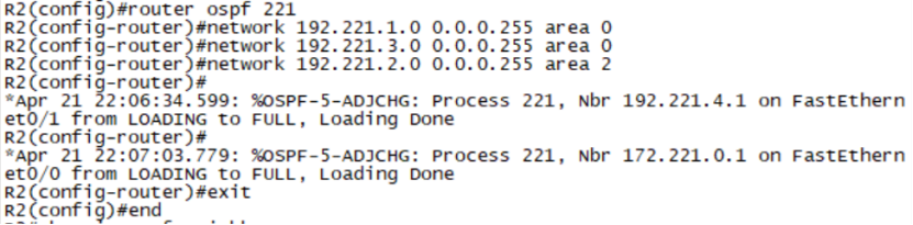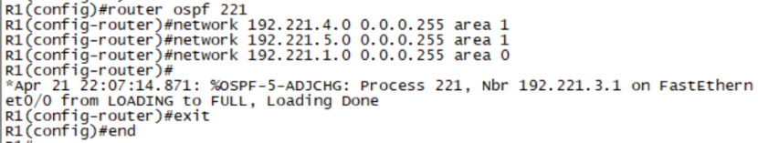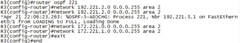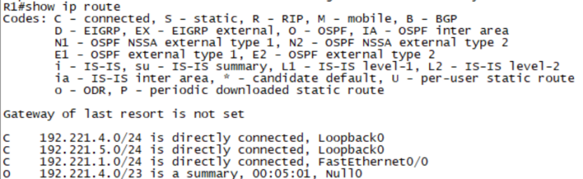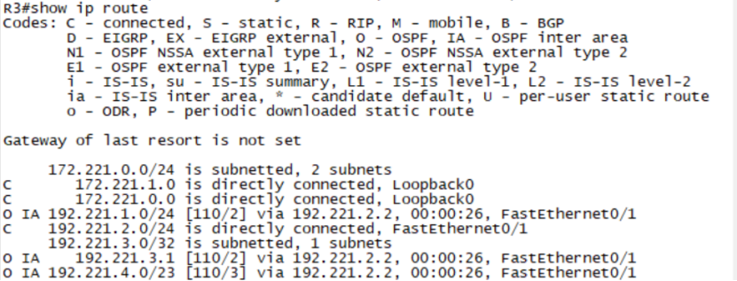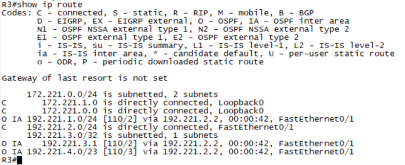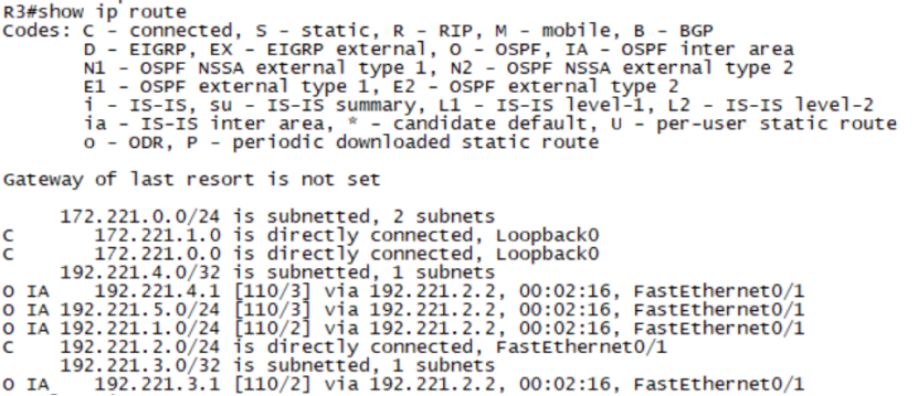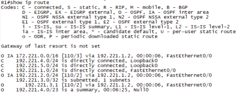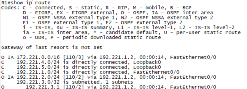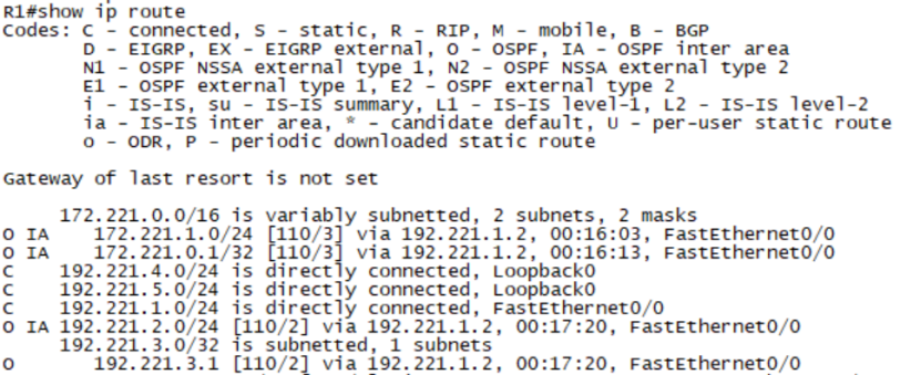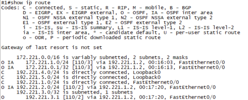 O IA 172.221.1.0/24 [110/3] via 192.221.1.2, 00:16:03, FastEthernet0/0