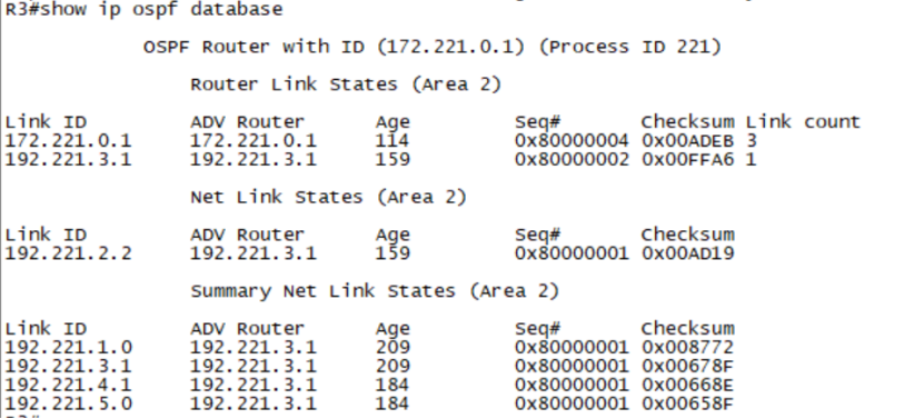 在路由器R1中查看链路状态数据库,会发现有2条类型3的LSA,我们可以在路由器R2(ABR)上进行区域汇总,减少路由条目。参考命令: