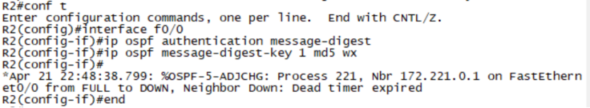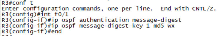 R2(config-if)#ip ospf message-digest-key 1 md5 cisco #此处密码修改为自己姓名