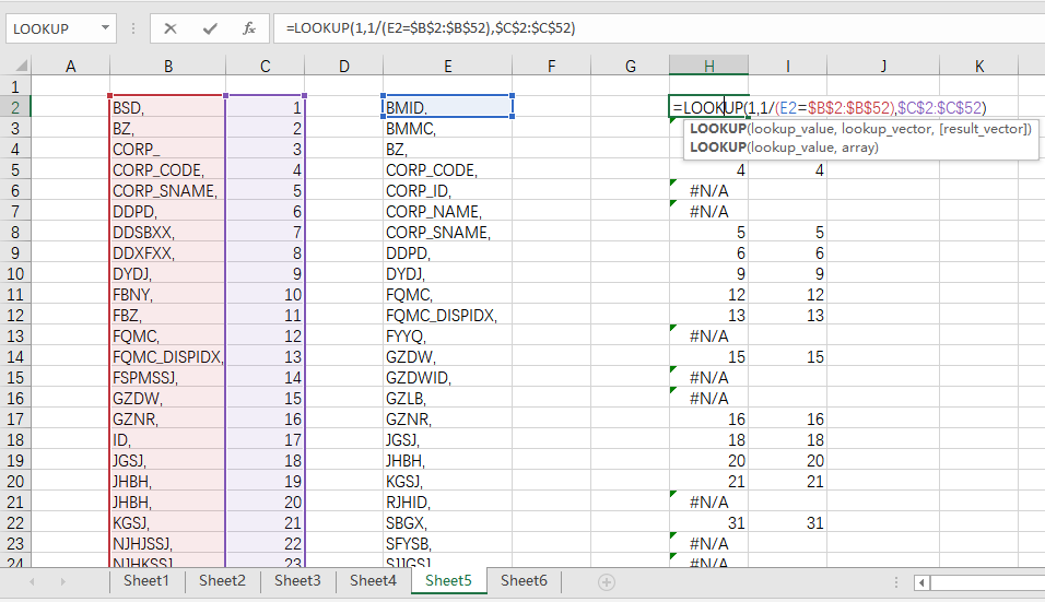 1、H列为结果列,在B-C表中,查找使B=E,然后取出B-C表的值,即C列,H公式为:
