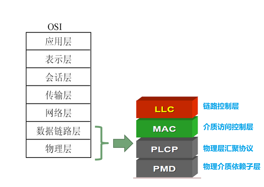 区别在于底层,上层是一样的,因为可能802.11就只是对物理层和链路层进行了新得规定,其余层和OSI是一样得