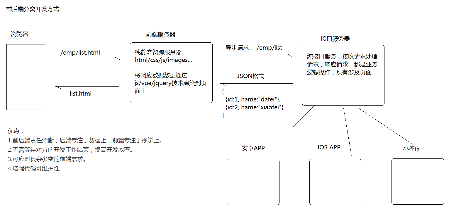 在开发阶段,前后端人员约定好数据交互接口,即可并行开发与测试。