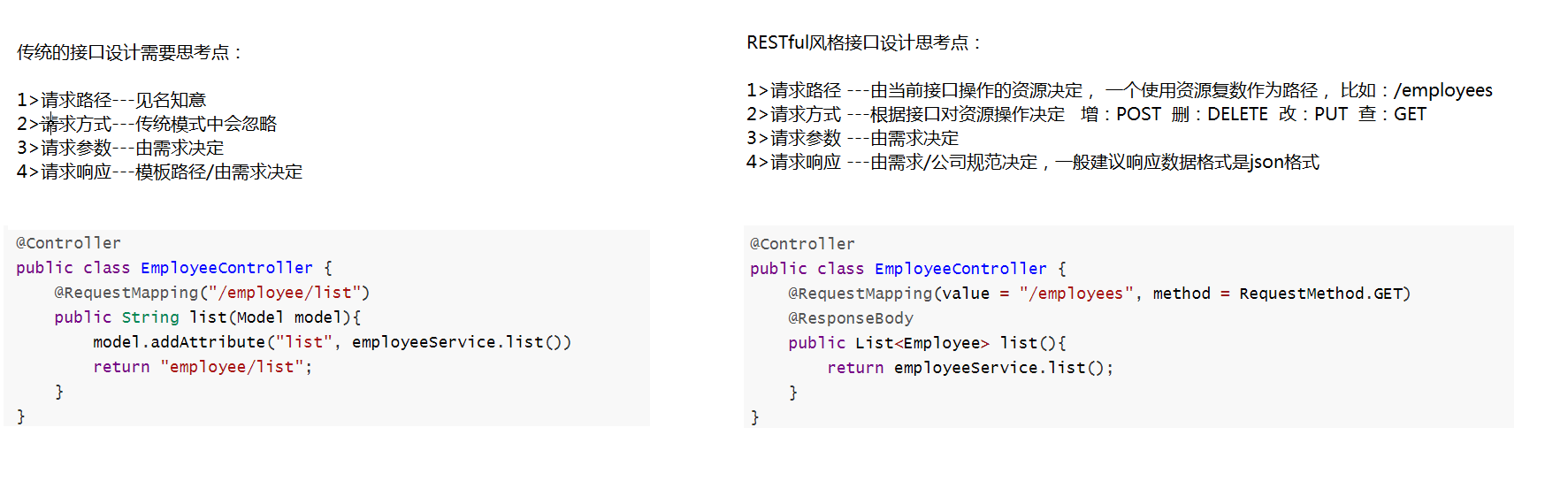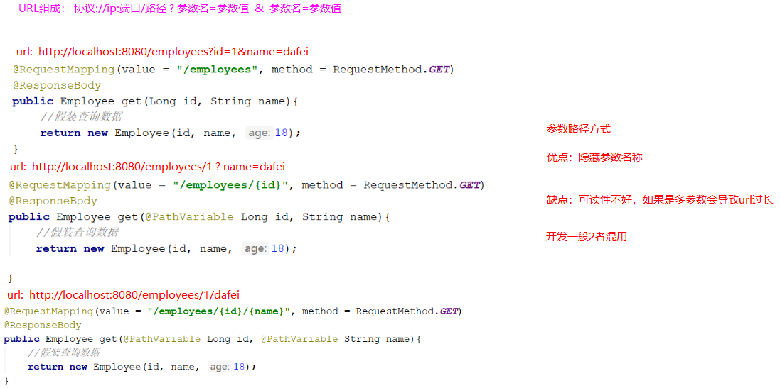 回归到代码,url http://localhost:8080/employee?id=1 表示查询数据库中id=1的员工信息,这个员工信息就是restful中描述的资源,一般资源都不会只有一个,就像员工不仅仅只有id=1的数据,大多都是以复数,所以RESTful 约定:针对接口要操作资源统一使用复数。