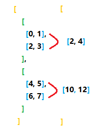 如果把一对括号括起来的部分看为一个集合,集合内元素个数就是所谓的各个维度对应的数值,上图中橙色的2表示最外层的括号内部有2个元素,绿色和蓝色的含义与此相同,所以说当axis指定0时,意思就是看外层的黄色括号,把内部的两个元素进行求和,此时如果keepdims = False也就意味着要将最外层的这一维度去掉,即下图所示
