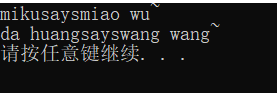 #include<string> #include<iostream> using namespace std; class MachinePets { public: MachinePets(const string s); virtual string talk()=0; string getNickname() { return nickname; } private: string nickname; }; class PetCats:public MachinePets{ public: PetCats(const string s); string talk(); }; class PetDogs :public MachinePets { public: PetDogs(const string s); string talk(); }; MachinePets::MachinePets(const string s) :nickname(s) { } PetCats::PetCats(const string s):MachinePets(s) { } string PetCats::talk() { string a = "miao wu~"; return a; } PetDogs::PetDogs(const string s) :MachinePets(s) { } string PetDogs::talk() { string a = "wang wang~"; return a; } void play(MachinePets *p) { cout << p->getNickname() << "says" << p->talk() << endl; } int main() { PetCats cat("miku"); PetDogs dog("da huang"); play(&cat); play(&dog); system("pause"); return 0; }