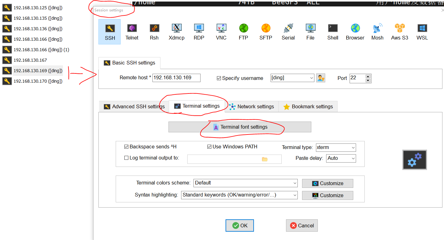 2:选中以后在session settings 里面设置terminal settings ->字体设置 -> terminal font settings