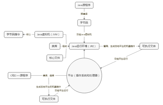 Java语言提供的编译器不针对特定的平台进行编译,而是针对Java虚拟机编译成字节码(.class文件),字节码被Java虚拟机(Java解释器是Java虚拟机的一部分)解释、运行。Java虚拟机将字节码翻译成本地计算机的机器指令,并将机器指令交给平台运行