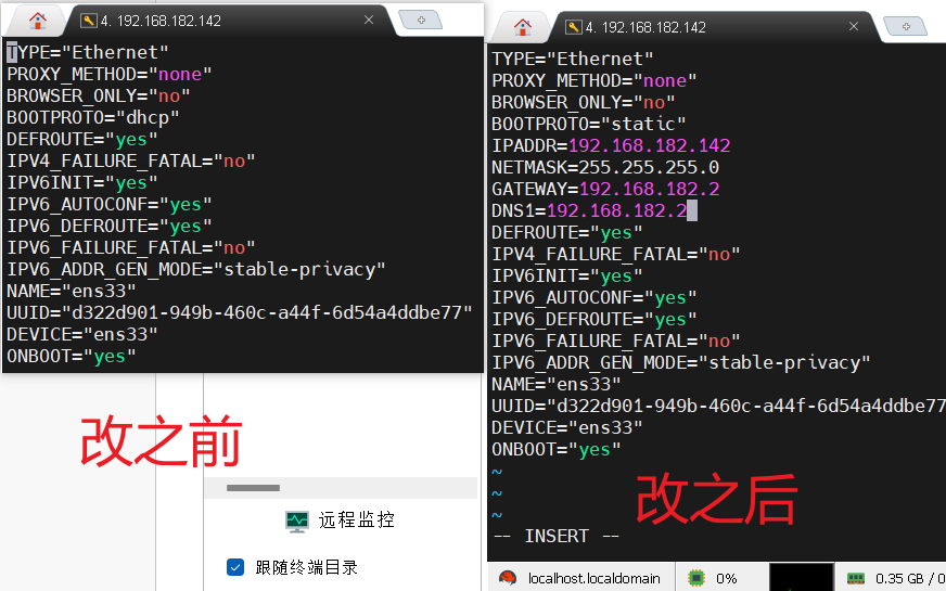 反正改后的样子如下图所示(我不想再重新新建会话远程连接虚拟机了,因为我懒,但是我可以保证我的配置静态ip是正确的),改完后要按下esc键,输入:wq回车保存退出