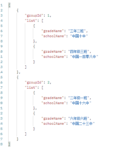 1 public List<Map<String, Object>> lambdaTest(){ 2 Grade gradeOne = new Grade(); 3 gradeOne.setGradeName("三年二班"); 4 gradeOne.setSchoolName("中国十中"); 5 gradeOne.setGroupId(1); 6 Grade gradeTwo = new Grade(); 7 gradeTwo.setGradeName("二年级一班"); 8 gradeTwo.setSchoolName("中国十六中"); 9 gradeTwo.setGroupId(2); 10 Grade gradeThree = new Grade(); 11 gradeThree.setGradeName("四年级三班"); 12 gradeThree.setSchoolName("中国一百零八中"); 13 gradeThree.setGroupId(1); 14 Grade gradeFour = new Grade(); 15 gradeFour.setGradeName("六年级六班"); 16 gradeFour.setSchoolName("中国二十三中"); 17 gradeFour.setGroupId(2); 18 19 List<Grade> gradeList = new ArrayList<>(); 20 gradeList.add(gradeOne); 21 gradeList.add(gradeTwo); 22 gradeList.add(gradeThree); 23 gradeList.add(gradeFour); 24 25 Map<Integer, List<Grade>> gradeMap = gradeList.stream().collect(Collectors.groupingBy(Grade::getGroupId)); 26 System.out.println(gradeMap.toString()); 27 28 List<Map<String, Object>> responseList = new ArrayList<>(); 29 gradeMap.forEach((key,value) -> { 30 Map<String, Object> map = new HashMap<>(); 31 map.put("groupId", key); 32 map.put("list", listConvertMap(value)); 33 responseList.add(map); 34 }); 35 36 return responseList; 37 } 38 39 List<Map<String, Object>> listConvertMap(List<Grade> list){ 40 List<Map<String, Object>> responseList = new ArrayList<>(); 41 for (Grade grade : list) { 42 Map<String, Object> map = new HashMap<>(); 43 map.put("schoolName", grade.getSchoolName()); 44 map.put("gradeName", grade.getGradeName()); 45 responseList.add(map); 46 } 47 return responseList; 48 }