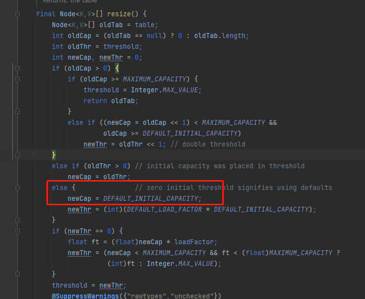 3、接下来走resize方法,因为其他属性都为默认值,所以容量大小会设置为:DEFAULT_INITIAL_CAPACITY