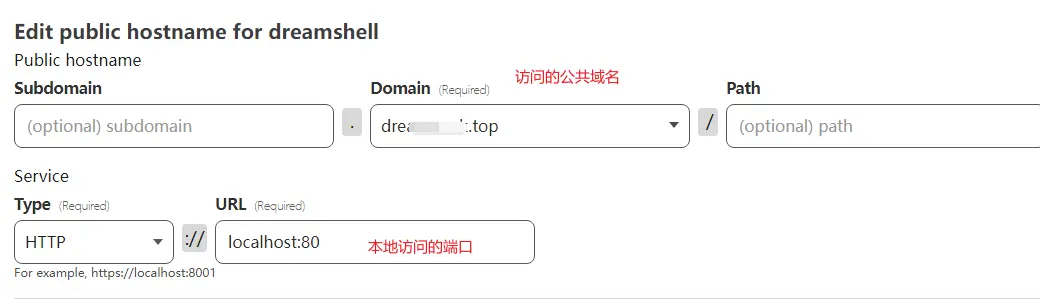 8.编辑通道设置,再public hostname中添加公共域名(或者子域名)和访问本地服务器的端口