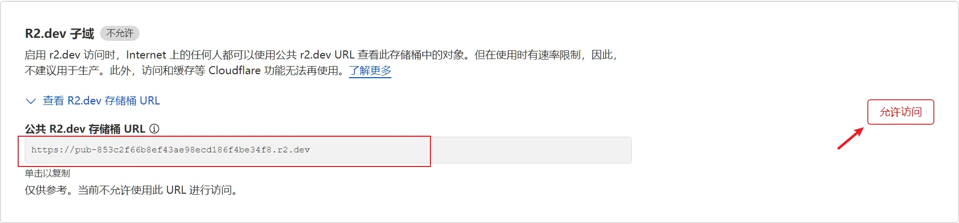 点击允许访问,就可以用 https://pub-853c2f66b8ef43ae98ecd186f4be34f8.r2.dev访问桶
