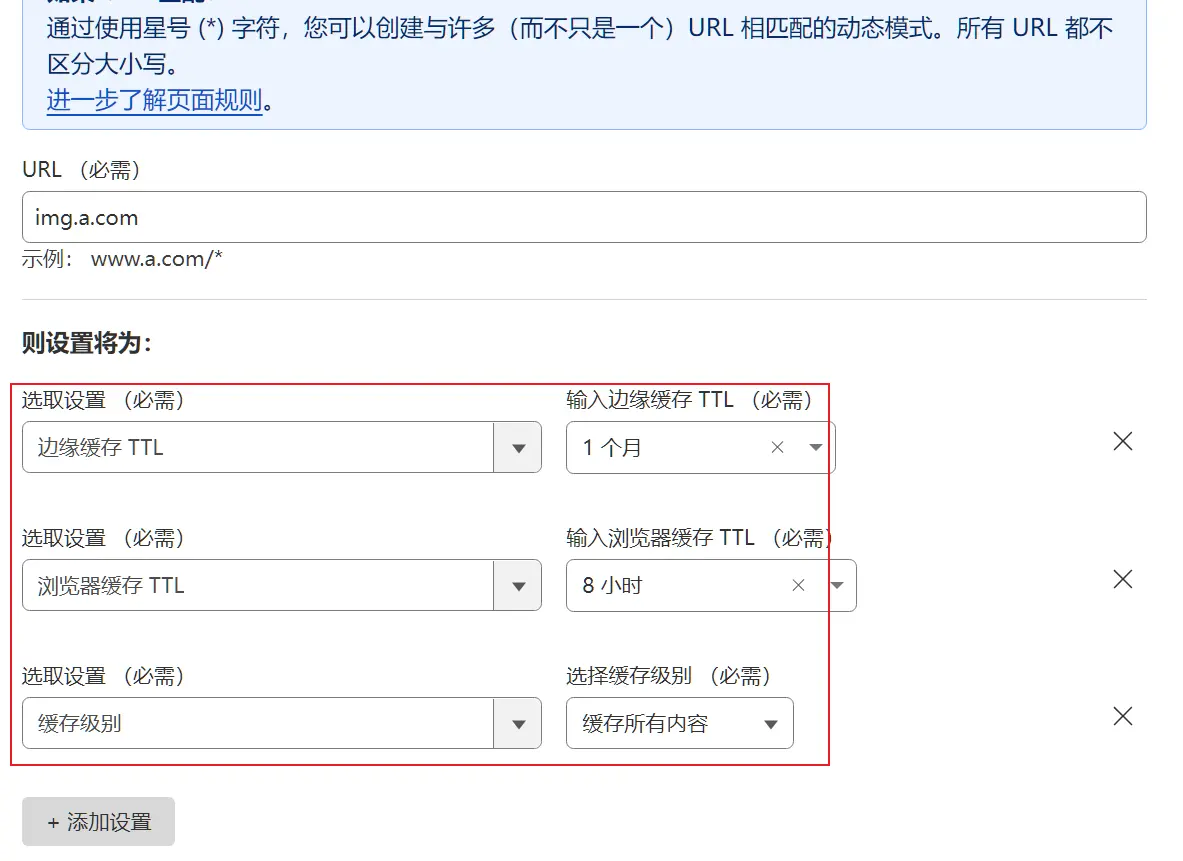 添加设置:边缘缓存 TTL – 一个月(图片内容只有存在或者删除两个状态,所以越长越好)