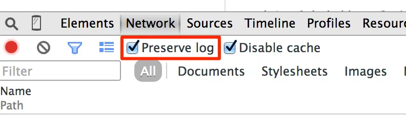 - 从屏幕底部或右侧打开的面板中,选择 网络 选项卡。确保 网络 选项卡左上角的 录制 按钮显示为 红色。选中 保留日志 旁边的框。