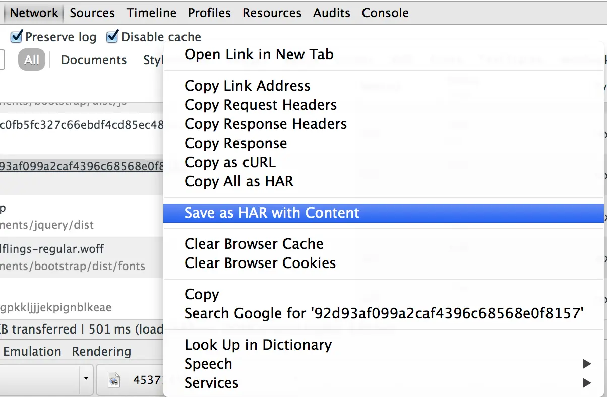 重现任务后,右键单击网络请求网格上的任意位置。选择 另存为带内容的 HAR。