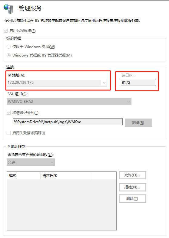 若这里的IP地址限制中,未指定的客户端的访问全为禁止,那么你需要指定你的发布客户端所在IP被允许访问