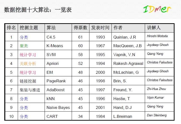 国际权威的学术组织the IEEE International Conference on Data Mining (ICDM) 2006年12月评选出了数据挖掘领域的十大经典算法:C4.5, k-Means, SVM, Apriori, EM, PageRank, AdaBoost, kNN, Naive Bayes, and CART.