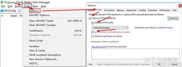 进入Tools-->Options-->HTTPS-->勾选Capture HTTPS CONNECTS-->勾选Decrypt HTTPS traffic --> 勾选 Ignore server certificate errors