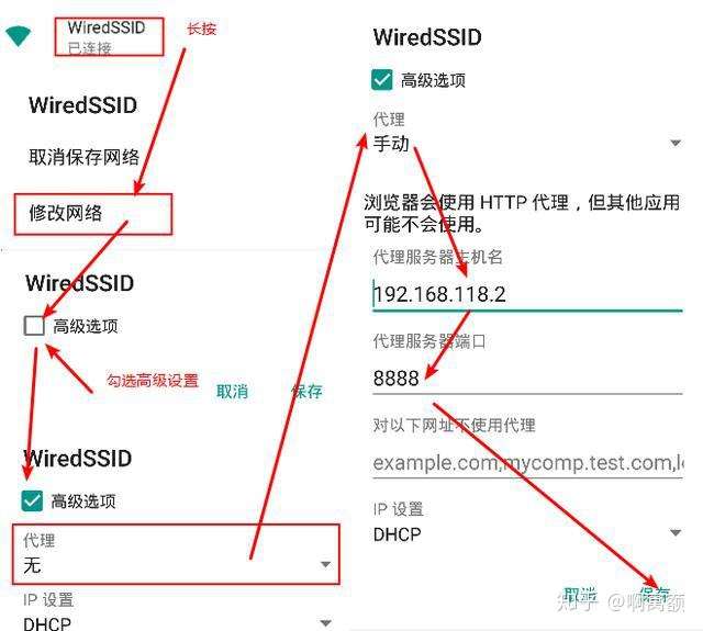 选中网络对应的无线连接名称长按-->修改网络-->高级选项-->代理手动--填写代理IP地址和端口--保存