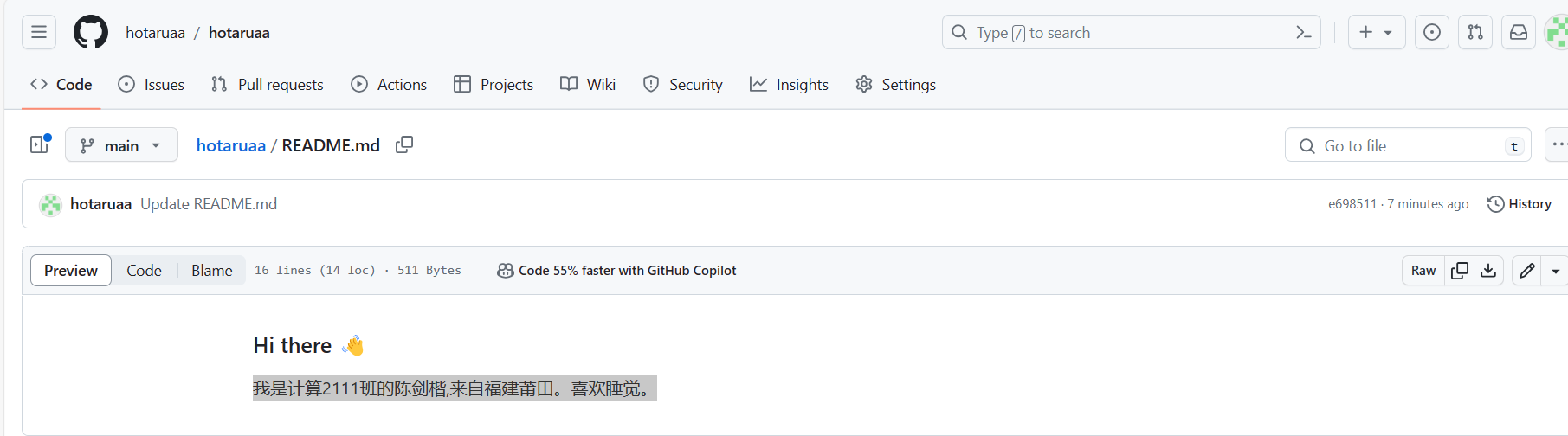 我是计算2111班的陈剑楷,来自福建莆田。喜欢睡觉。
