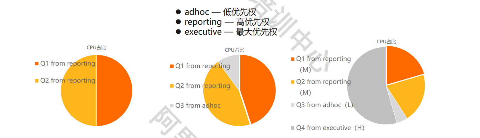 例如,管理员创建三个资源队列:adhoc用于业务分析师提交的正在进行的查询,reporting用于计划的报表任务,而executive用于行政用户角色递交的查询。由于分析师可能临时提交查询,而这些查询的资源需求是不可预测的,管理员想要确保计划的报表任务不会受到这类查询的严重影响。还有,管理员想要确保行政角色递交的查询会被分配相当份额的CPU。相应地,资源队列的优先权被设置如下:
