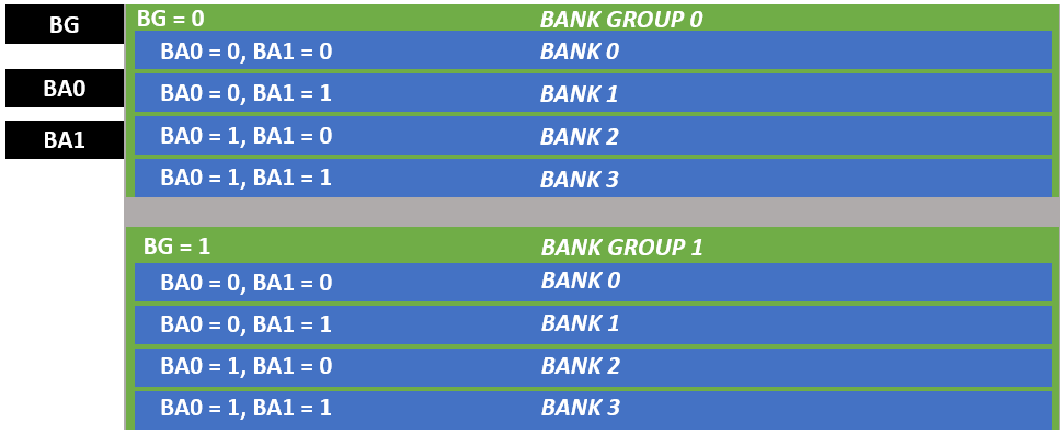 单个BANK GROUP共4个BANK,每个BANK GROUP存储容量为512MB。