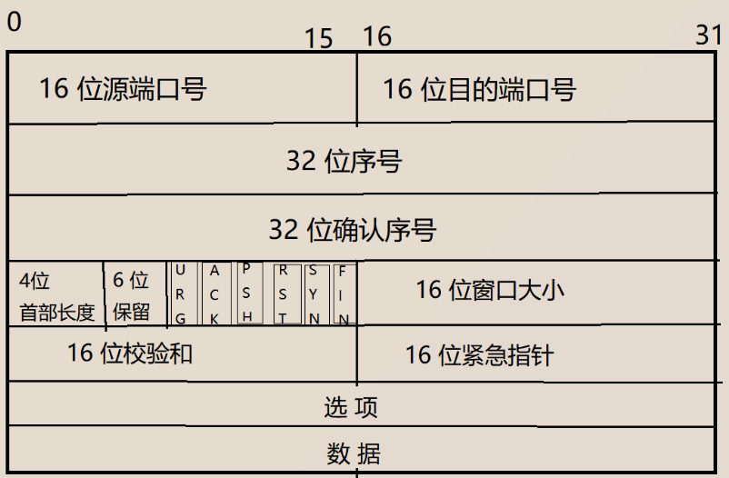 - 16位检验和: 由发送端填充, 检验形式有CRC校验等. 如果接收端校验不通过, 则认为数据有问题. 此处的校验和不光包含TCP首部, 也包含TCP数据部分.