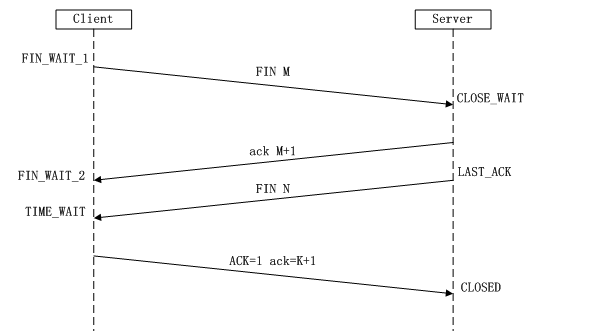 (2)第二次挥手:Server收到FIN后,发送一个ACK给Client,确认序号为收到序号+1(与SYN相同,一个FIN占用一个序号),Server进入CLOSE_WAIT状态。