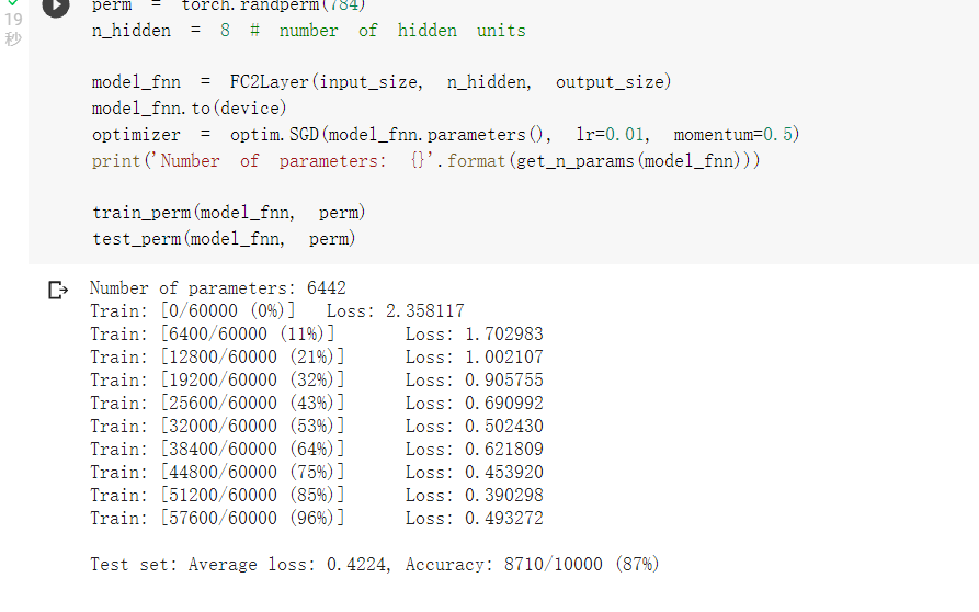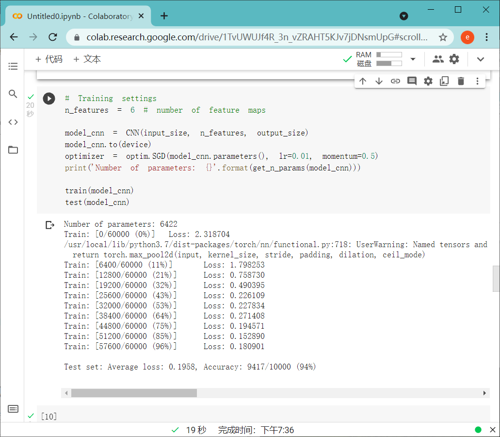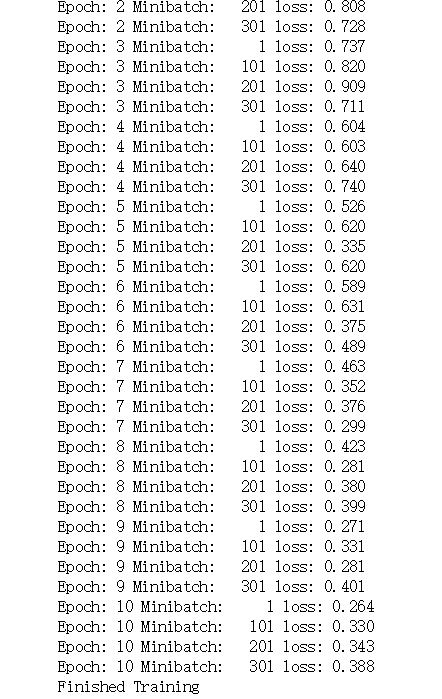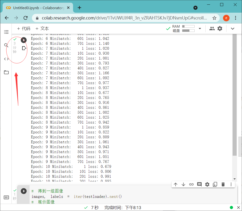 首先加载一些图片,然后定义网络、损失函数和优化器,然后经过了长达三分钟的网络训练
