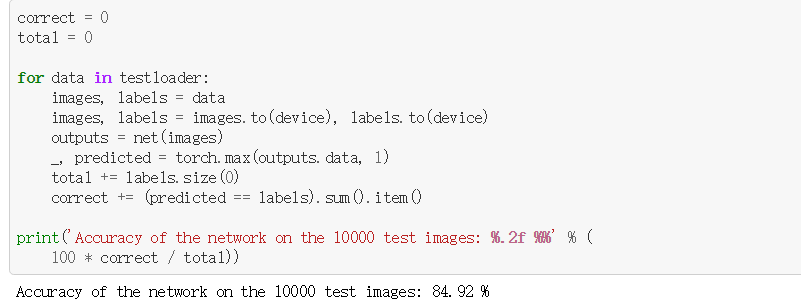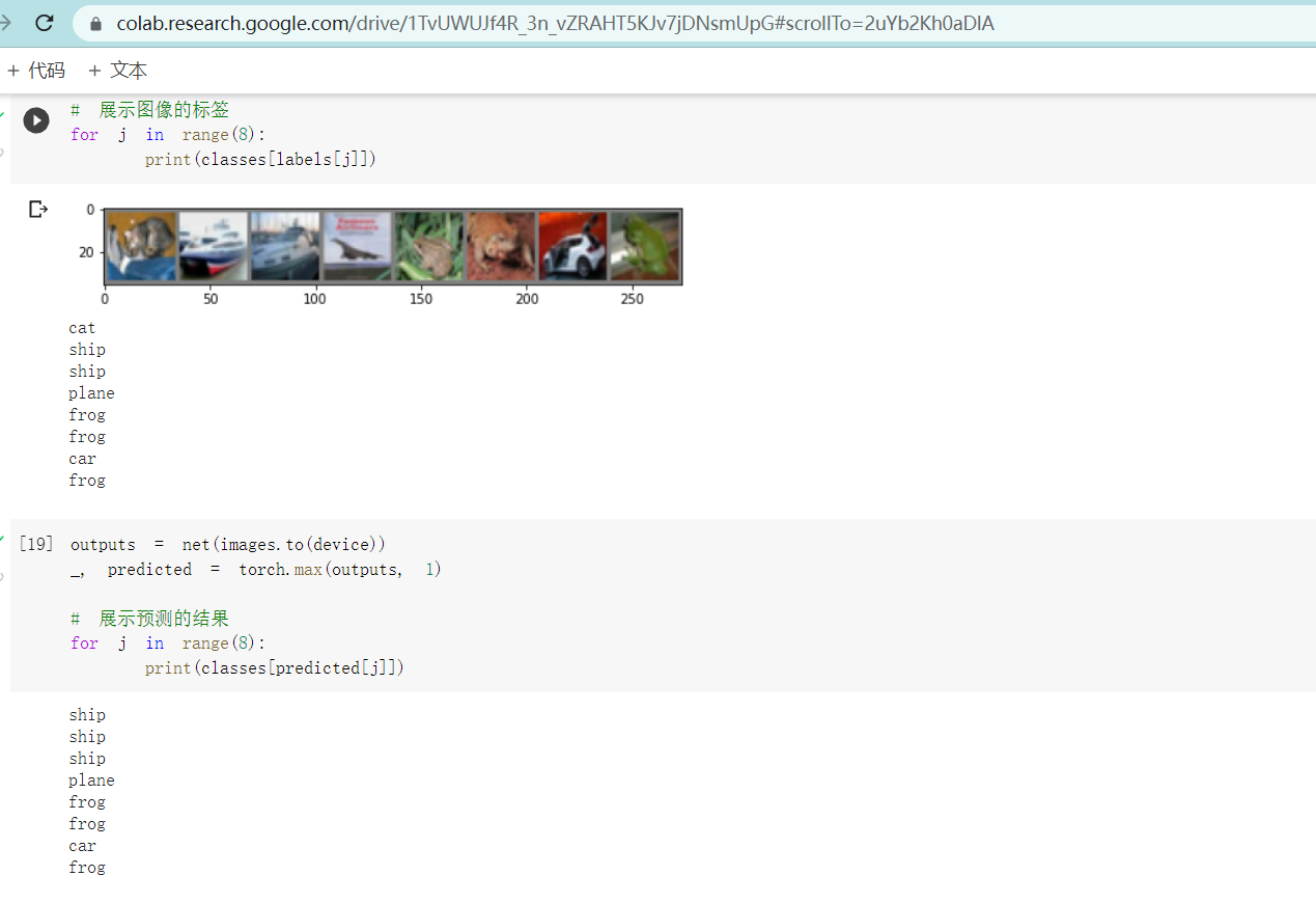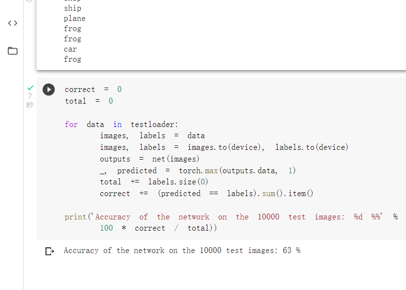 发现除了第一张cat识别成了ship,其他都对了,还是可以的。