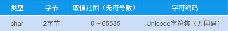 // char取值范围 0 ~ 65535 无符号
