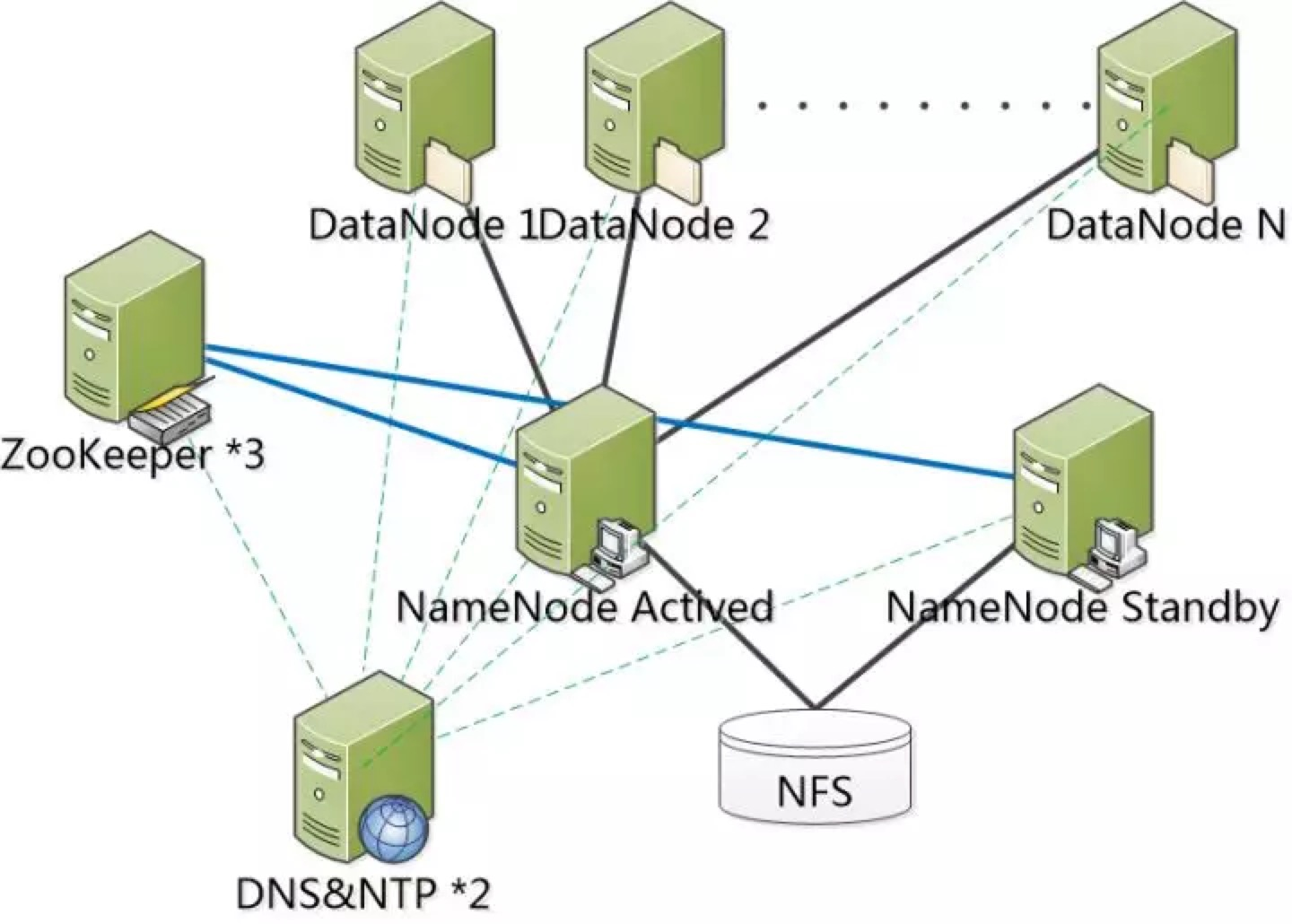这个高可用的HDFS架构是由3台zookeeper设备、2台域名服务(DNS)和时间服务(NTP)设备、2台Namenode设备(如果必要Standby可以更多)、一个共享存储设备(NFS)和N个DataNode组成。