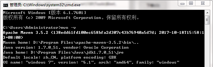 5、检查Maven是否安装成功,使用mvn -v,当检测到版本,说明安装配置成功