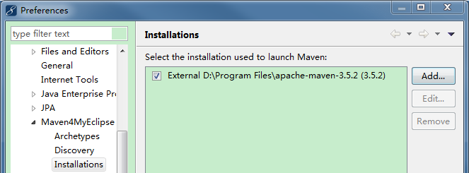 1、打开MyEclipse,菜单栏Window->Preferences->Maven4MyEclipse->Installations,点击右侧Add,选择Maven解压路径
